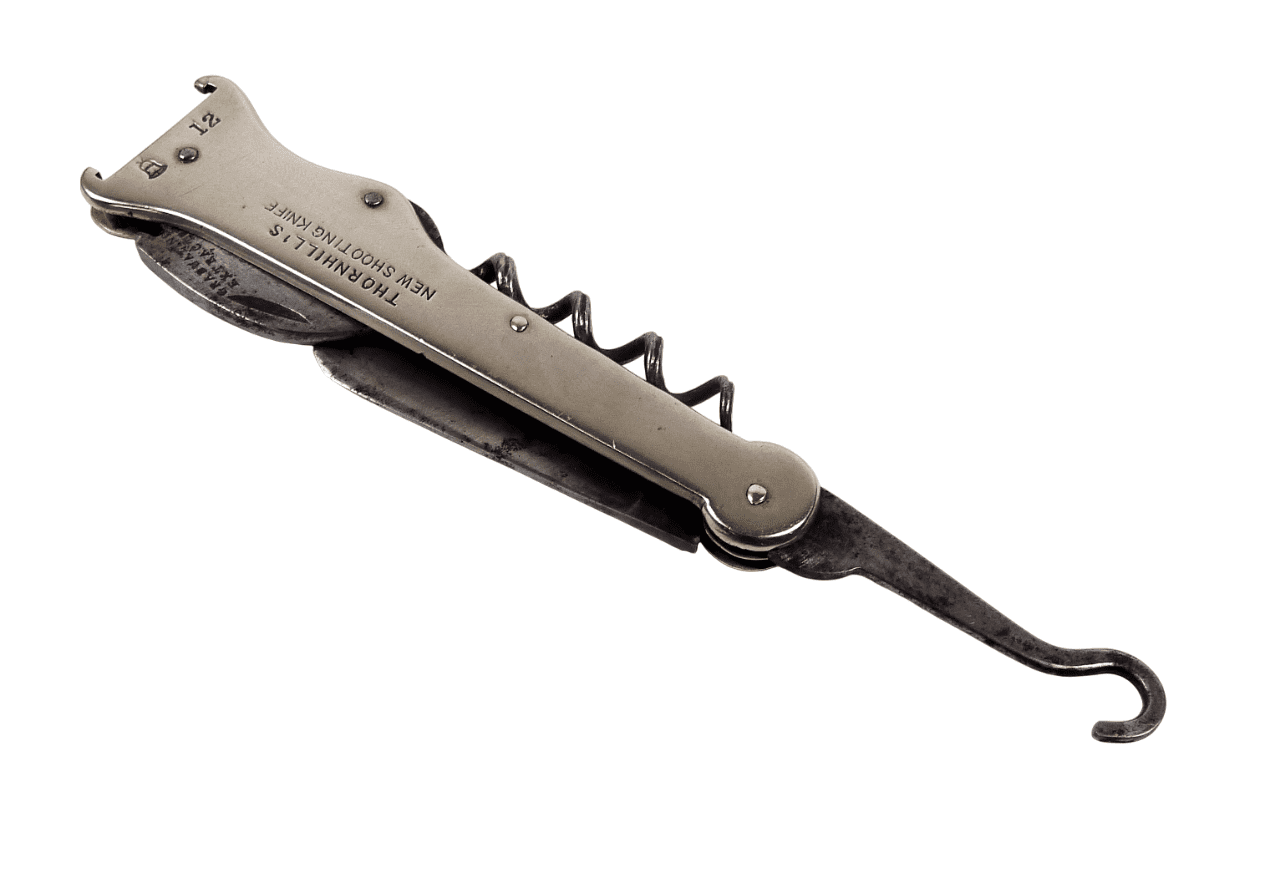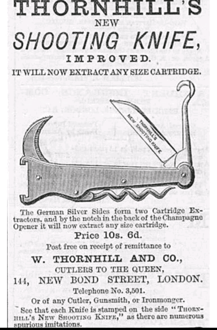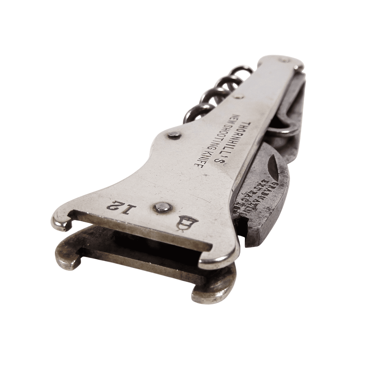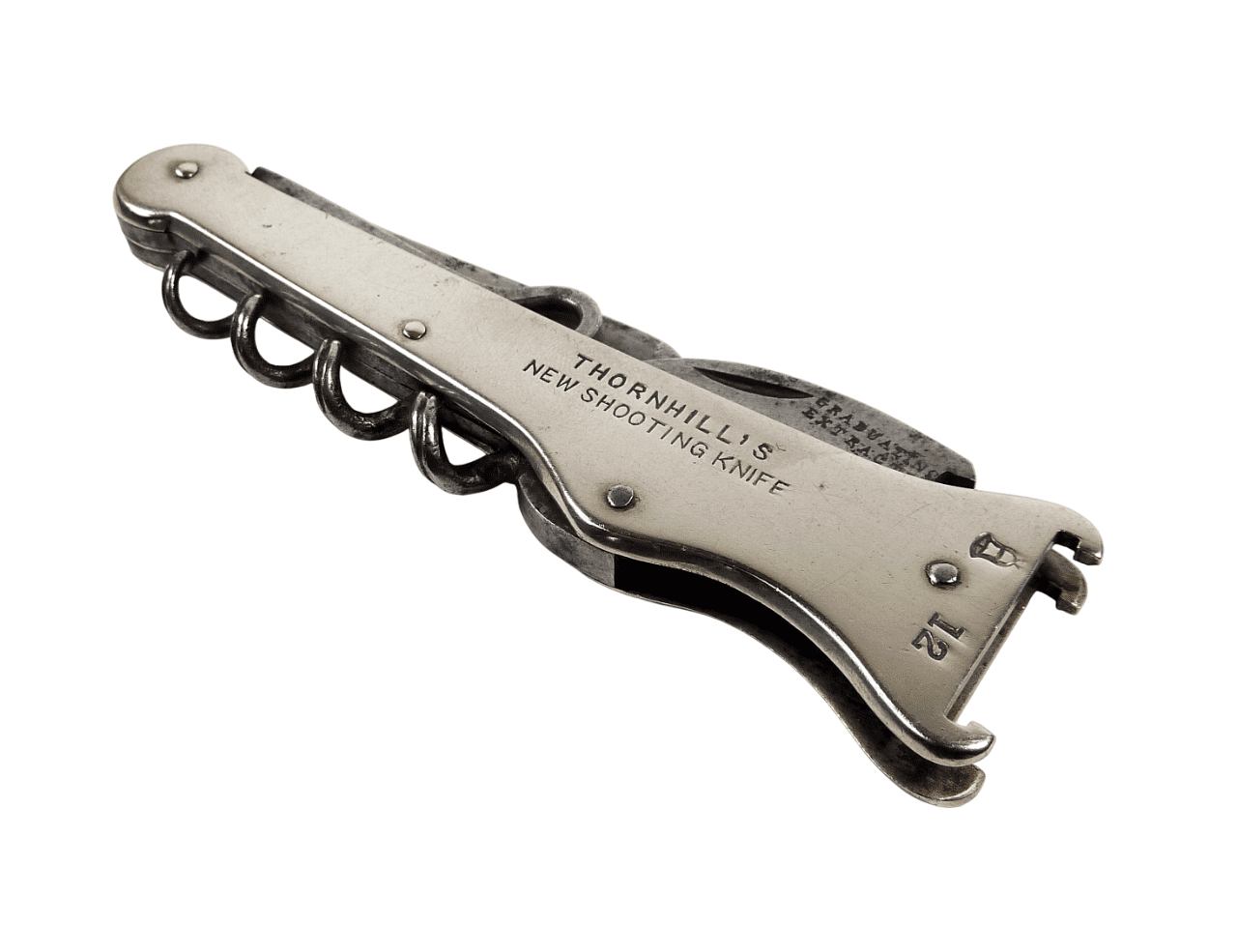 Item - Antique German Silver (Nickel Plated) 'New Shooting Knife' Folding Pocket Knife with Main Blade, Button Hook, Grooved Corkscrew, Champagne Opener & 16/12 Gun Cartridge Extractor produced by Brookes & Crookes and marketed by W Thornhill & Co (Cutlers to the Queen) of 144 New Bond Street, London, England, Circa 1880/90s. The German Silver (Nickel Plate) Sides form two Cartridge Extractors, and by the notch in the back of the Champagne Opener it would extract any size cartridge (Please See All Pics).