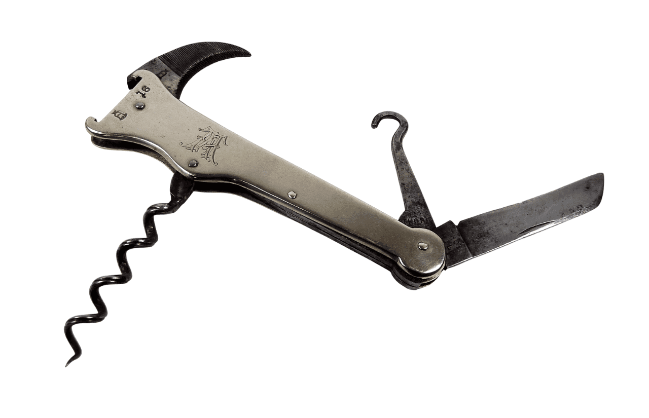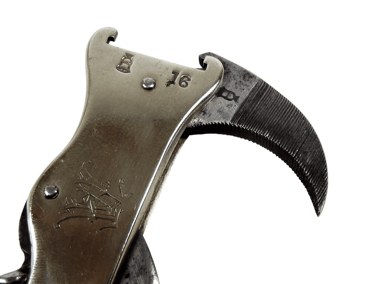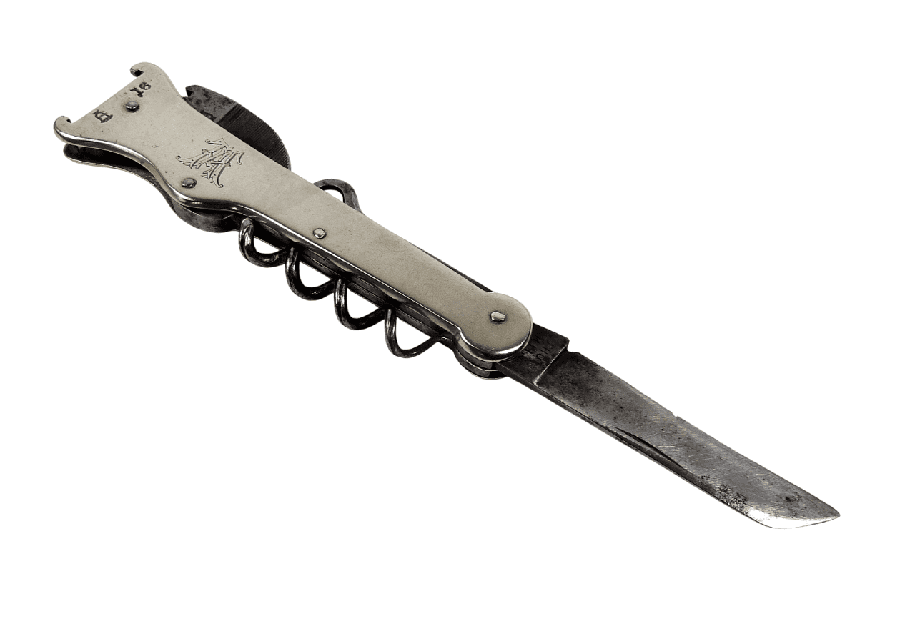 Item - Antique German Silver (Nickel Plated) 'New Shooting Knife' Folding Pocket Knife with Main Blade, Button Hook, Grooved Corkscrew, Champagne Opener & 16/12 Gun Cartridge Extractor produced by Brookes & Crookes and marketed by W Thornhill & Co (Cutlers to the Queen) of 144 New Bond Street, London, England, Circa 1880/90s. The German Silver (Nickel Plate) Sides form two Cartridge Extractors, and by the notch in the back of the Champagne Opener it would extract any size cartridge (Please See All Pics).