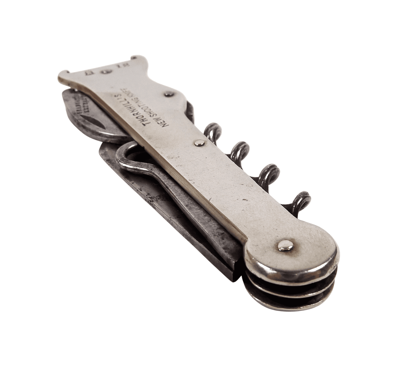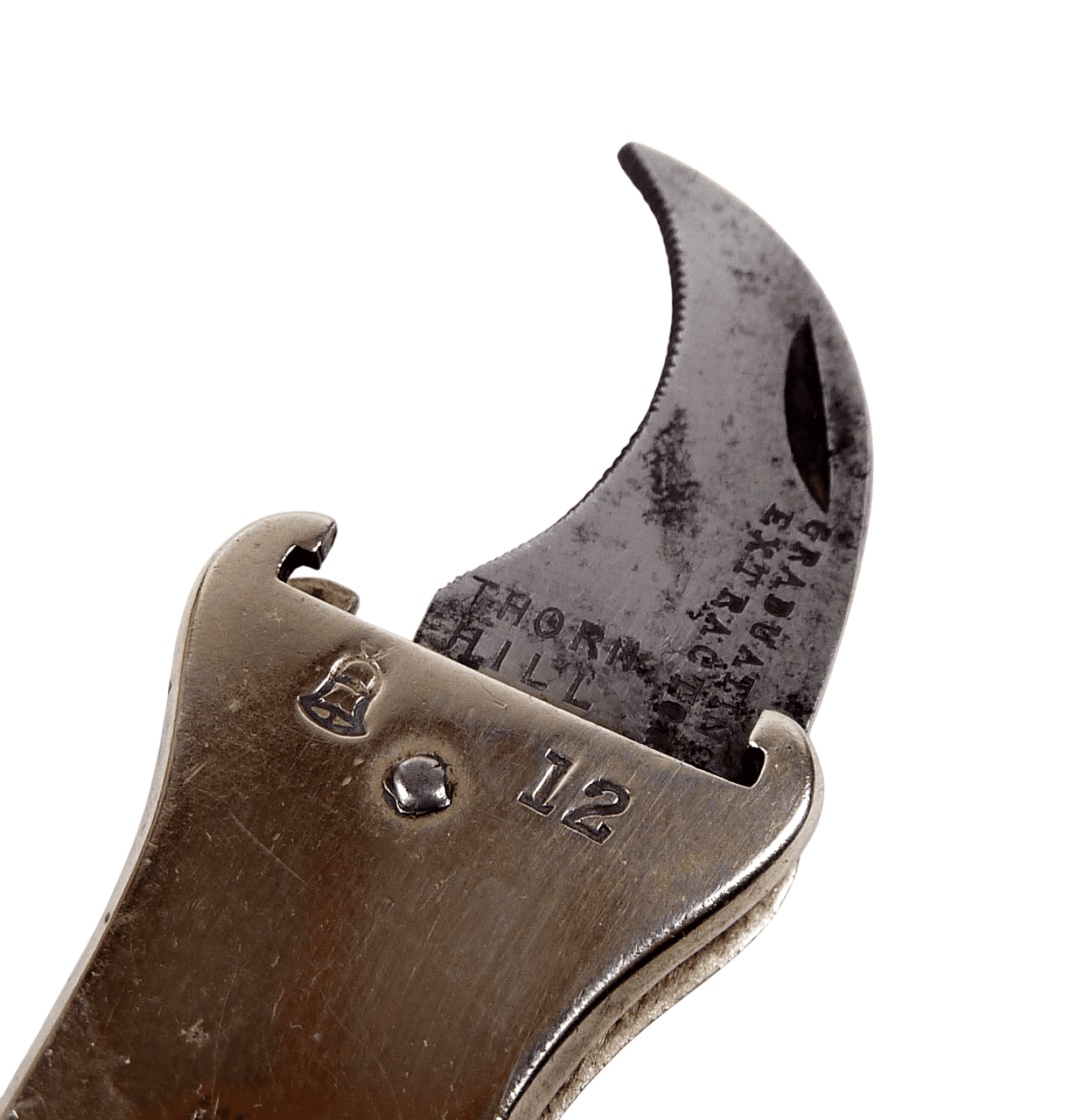 Marks - All the Tangs are stamped THORNHILL the champagne opener is also stamped GRADUATING EXTRACTOR and features the Bell Trademark of Brookes and Crookes, the maker of the knife. The knife is also monogrammed with a previous owners initials TA.