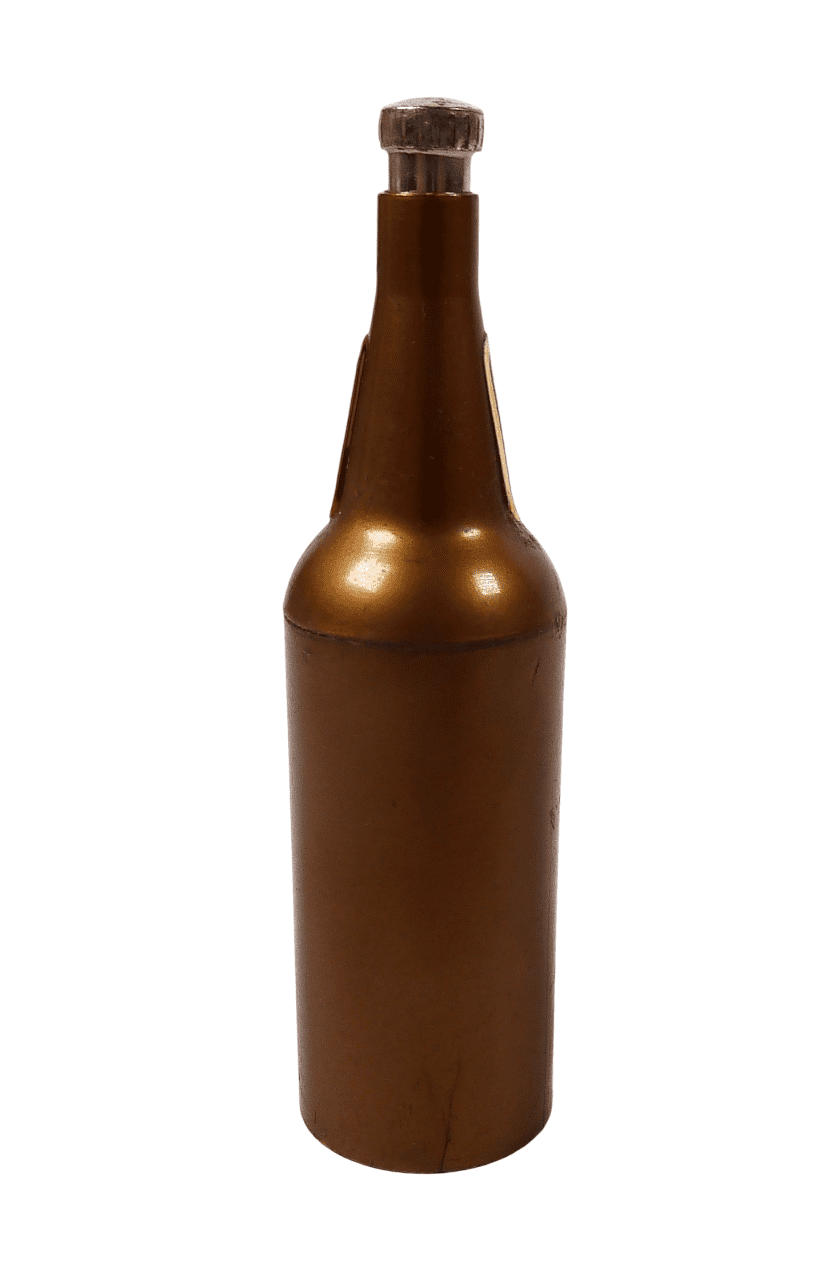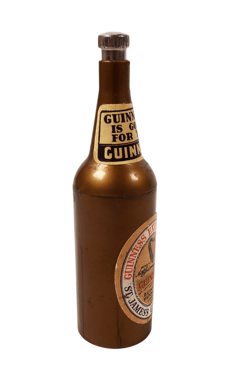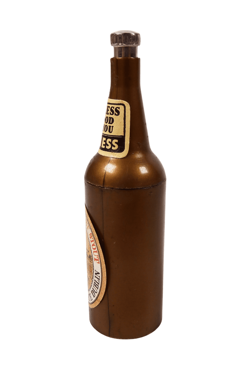 Item - Vintage Metal Push Button Figural Bottle Opener in the form of a Guiness Bottle complete with paper labels, Circa 1950/60s. This type of opener works by pushing the button on the top so that the opener drops down for use; to return back...just push button and push up.