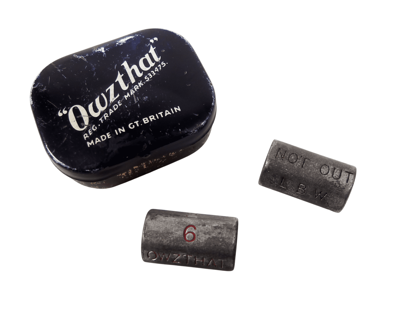 Item - Vintage 'Owzthat' Cricket Metal Dice Game in Original 'Larger' Tin complete with a copy of the Instructions, Circa 1930/50s; this tin is printed with the Registered Trademark 533475 which was first granted in 1908 by the British Patents Office..