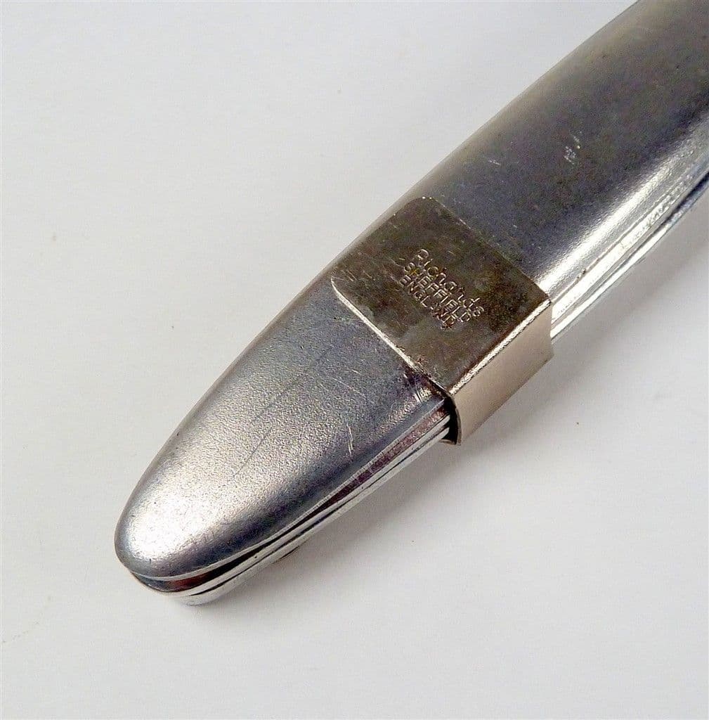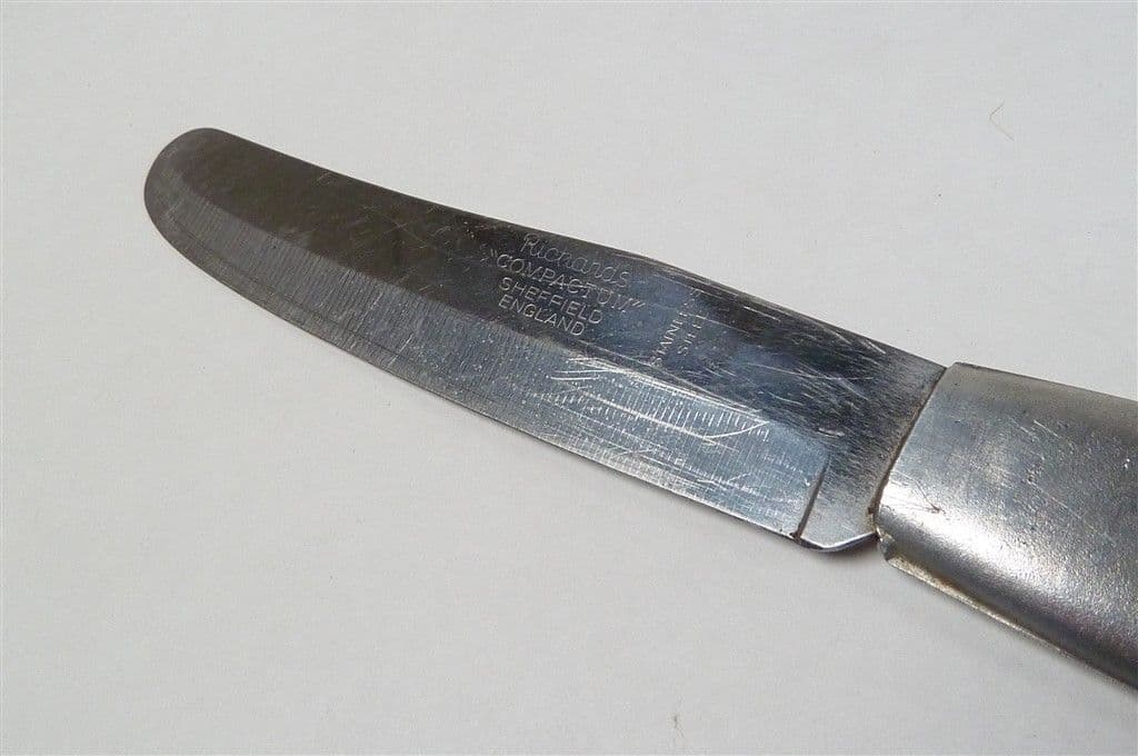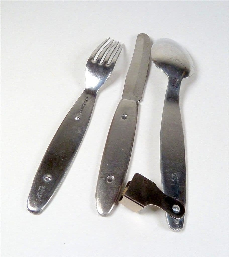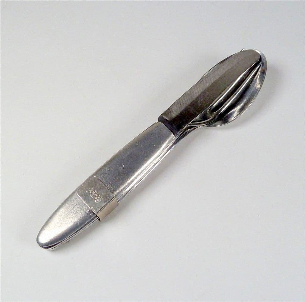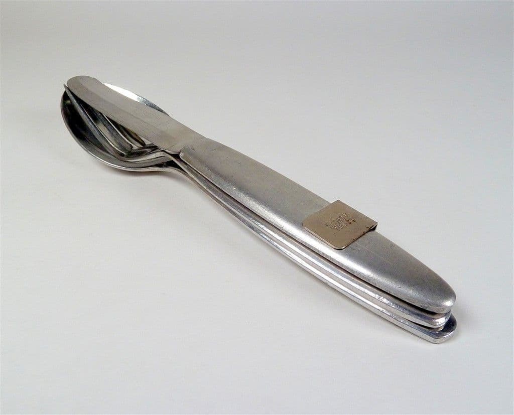 Item - Vintage Travel/Camping Richards of Sheffield 'Compactum' Cutlery Set, Circa 1960s; a aluminium knife, fork, spoon set that is held together with a swivel clip that when turned clockwise releases the set.