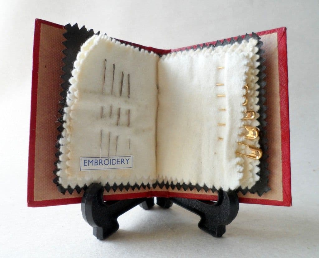 Construction - Red Leatherette on Board with paper & felt leaves containing 7 sharps, 4 embroidery, 6 safety pins, 1 darner and a further 10 sharps to the final leaf