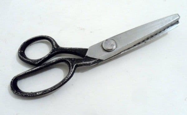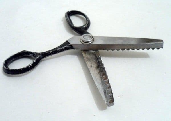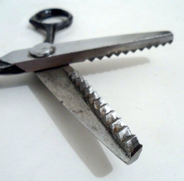 Other Interesting Points - Pinking shears have a utilitarian function for cutting woven cloth. Cloth edges that are unfinished will easily fray, the weave becoming undone and threads pulling out easily. The saw tooth pattern does not prevent the fraying but limits the length of the frayed thread and thus minimizes damage. Pinkers can also be used for making gift tags from Old Christmas Cards.